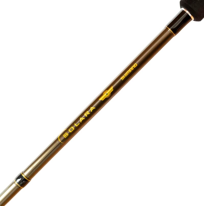Caña Shimano Solara, fabricada con un Blank en el concepto Aeroglass (compuesto de fibra de vidrio extremadamente resistente y ligero, de gran durabilidad), lo que le confiere la combinación ideal de resistencia y flexibilidad.