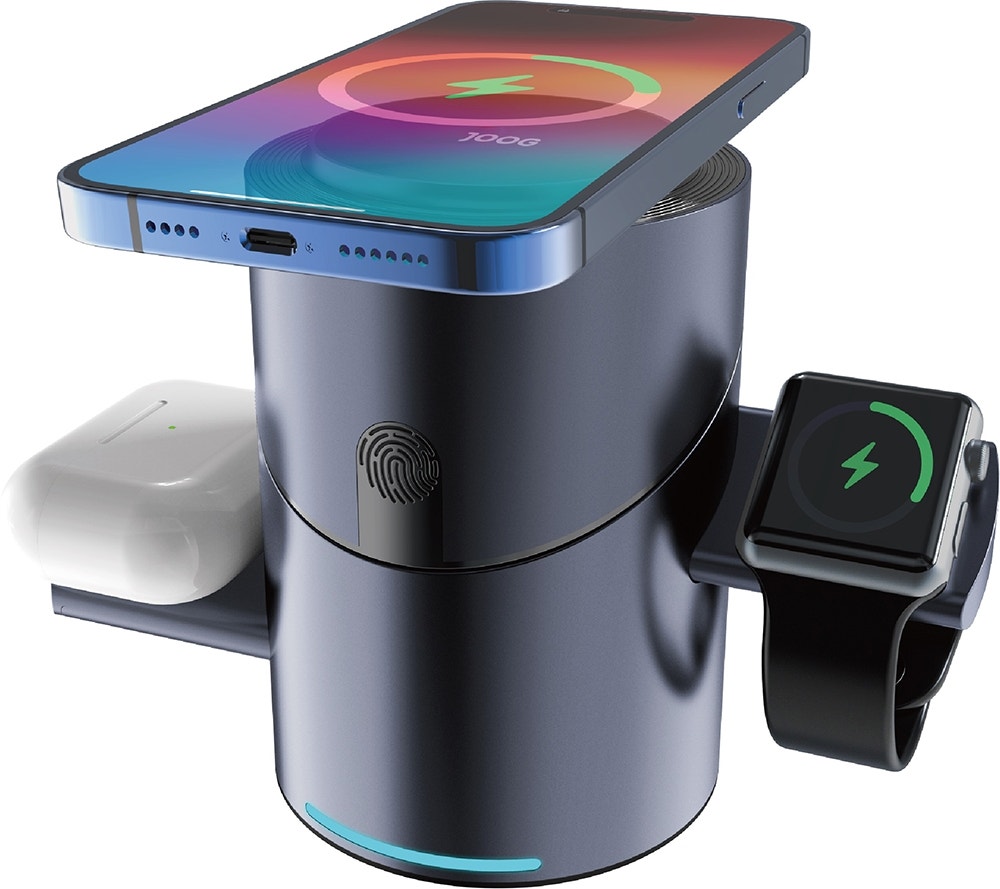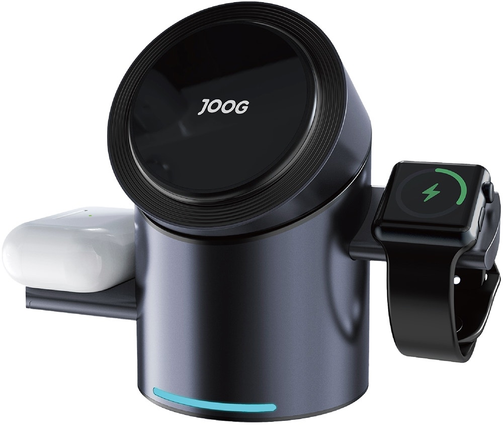 Cargador inalámbrico magnético multifuncional Joog MagCharger 3 in 1, con un diseño plegable y un botón táctil que permite soportar la función de rotación automática de 180°, capaz de cargar teléfonos móviles, auriculares y relojes inalámbricos al mismo tiempo mediante la fuente de alimentación. Despídete de los cables y comienza a disfrutar de la experiencia inalámbrica.