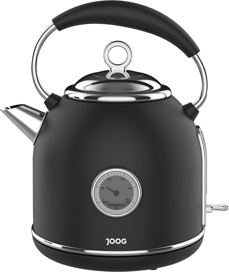 Diseño elegante en color negro mate con detalles plateados, acompañado de un termómetro analógico integrado que realza su estilo retro-moderno.