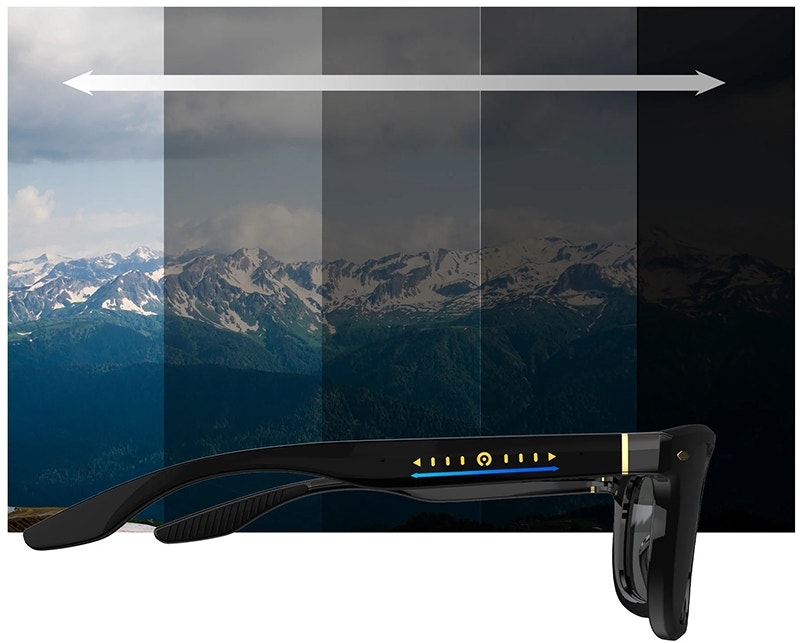 Función de atenuación deslizante: La función de atenuación deslizante permite cambiar la transmitancia de la lente tocando la punta de la patilla derecha y deslizándola hacia delante y hacia atrás. La transmitancia de la lente se puede cambiar en cinco etapas entre el 7% y el 38% para hacer frente a una variedad de condiciones de luz ambiental.