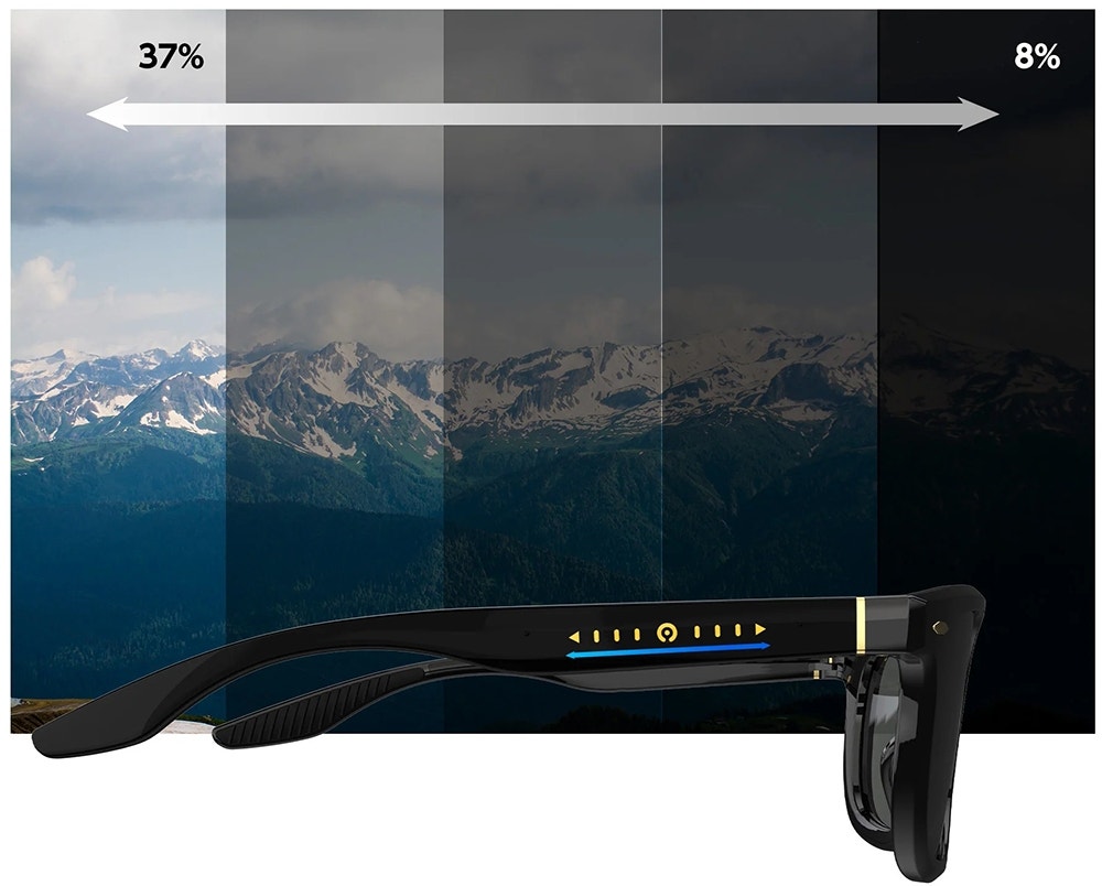 Función de atenuación deslizante: La función de atenuación deslizante permite cambiar la transmitancia de la lente tocando la punta de la patilla derecha y deslizándola hacia delante y hacia atrás. La transmitancia de la lente se puede cambiar en cinco etapas entre el 8% y el 37% para hacer frente a una variedad de condiciones de luz ambiental.