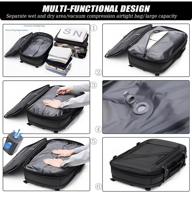 Graças ao seu sistema de compressão a vácuo, essa mochila reduz significativamente o volume dos seus pertences, permitindo viajar de maneira mais leve e organizada. Esqueça as mochilas volumosas e aproveite cada centímetro ao máximo.