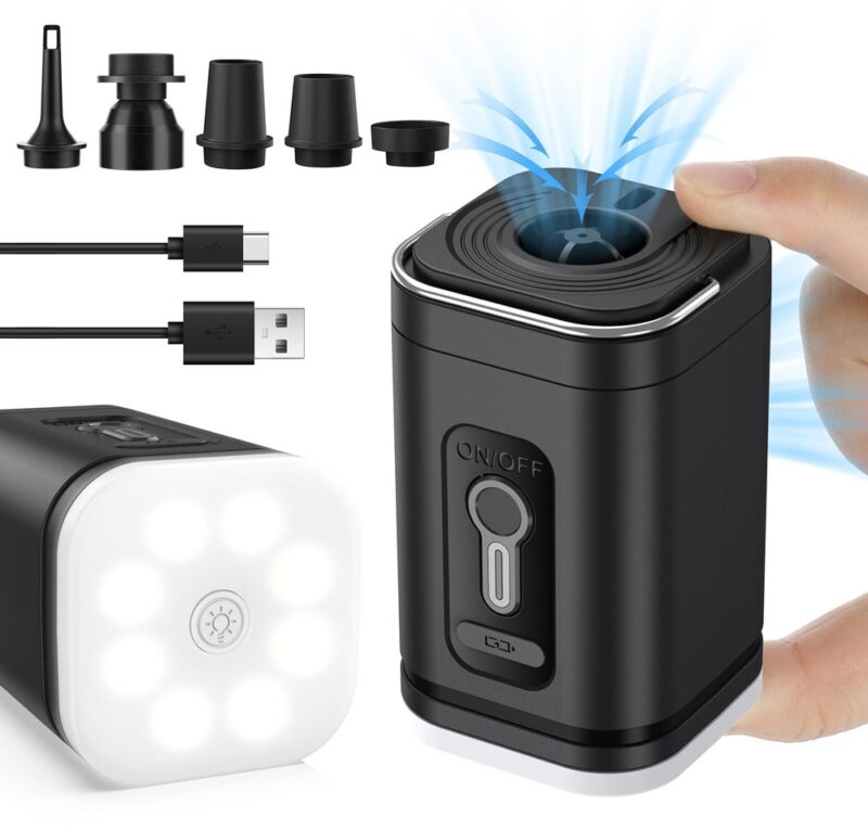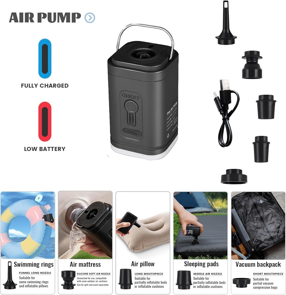 A bomba de ar inclusa permite inflar boias de piscina, colchões, travesseiros e esteiras infláveis, além de possibilitar o uso da função AIRBACK "compressão a vácuo" da mochila. Também conta com uma prática função de lanterna para camping.