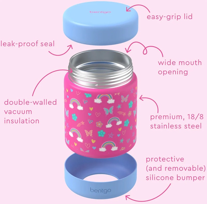 DOBLE AISLAMIENTO: Mantén tus comidas y refrigerios calientes o fríos durante horas gracias al aislamiento al vacío de doble pared y al resistente acero inoxidable 18/8. El diseño se completa con un colorido acabado semimate de nuestro divertido y superventas Bentgo Kids Print.